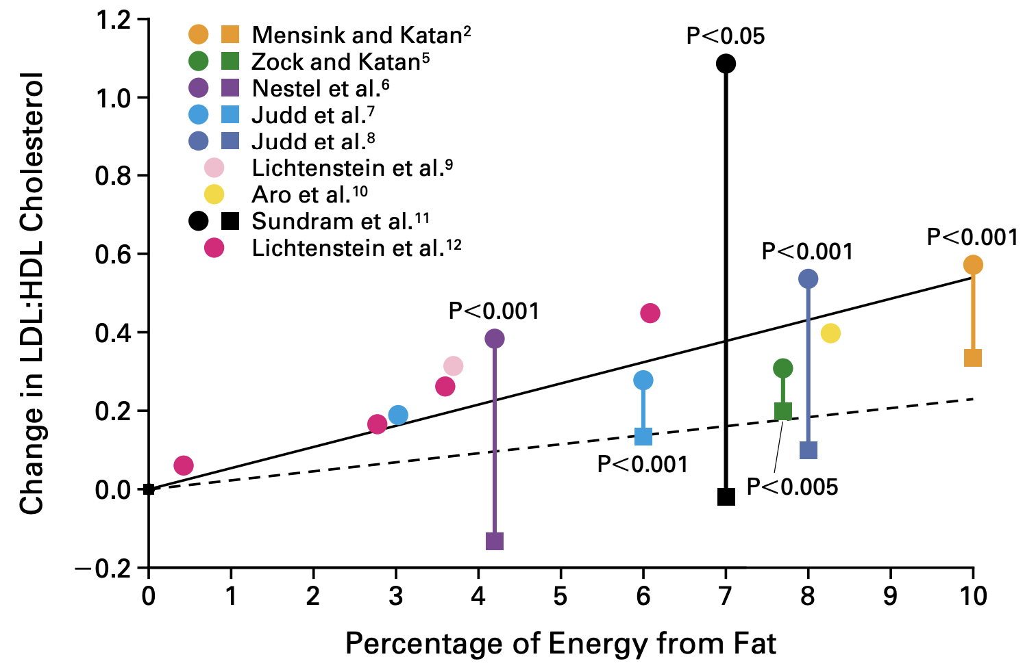 Resultados de estudios aleatorizados sobre los efectos de una dieta alta en ácidos grasos trans (círculos) o en ácidos grasos saturados (cuadrados) sobre el cociente colesterol LDL/colesterol HDL. Como grupo de comparación se utilizó una dieta con cantidades isocalóricas de ácidos grasos cis. La línea continua indica la recta de regresión de mejor ajuste para los ácidos grasos trans. La línea discontinua indica la recta de regresión de mejor ajuste para los ácidos grasos saturados.