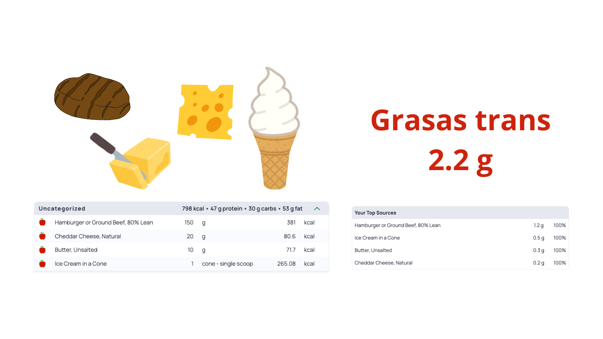 Comida típica de fin de semana: hamburguesa + queso cheddar + algo de mantequilla + cono de helado. Total aproximado: 2,2 g de grasas trans en una sola ingesta (sin contar pan/patatas por su aporte ínfimo).